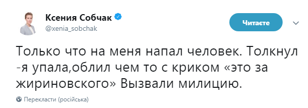 «Только что на меня напал человек. Толкнул — я упала,облил чем-то с криком «Это за Жириновского!». Вызвали полицию», — сказано в сообщении.