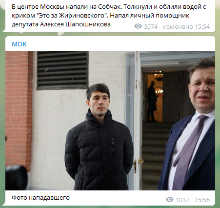На Telegram-канале MDK сообщили, что на Собчак напал личный помощник депутата Алексея Шапошникова. При этом пресс-секретарь чиновника Полина Орехова опровергла эту информацию.