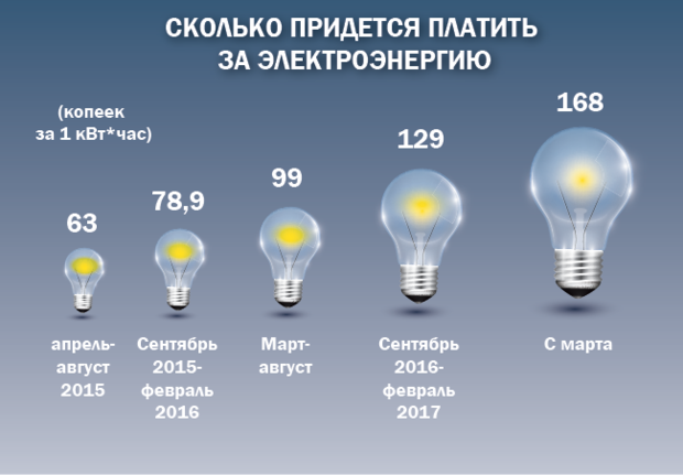 До апреля прошлого года семья, которая потребляет 150 кВт*час электроэнергии в месяц, покупала 100 кВт*час по цене за киловатт 45,6 копеек, еще 50 кВт по цене 78,9 копейки за киловатт. В сентябре прошлого года тариф утвердили на уровне 78,9 копеек при потреблении свыше 100 кВт и 45,6 копеек при потреблении до 100 кВт, в марте – до 99 и 57 копеек, а в сентябре – 129 и 71,4 копеек соответственно.