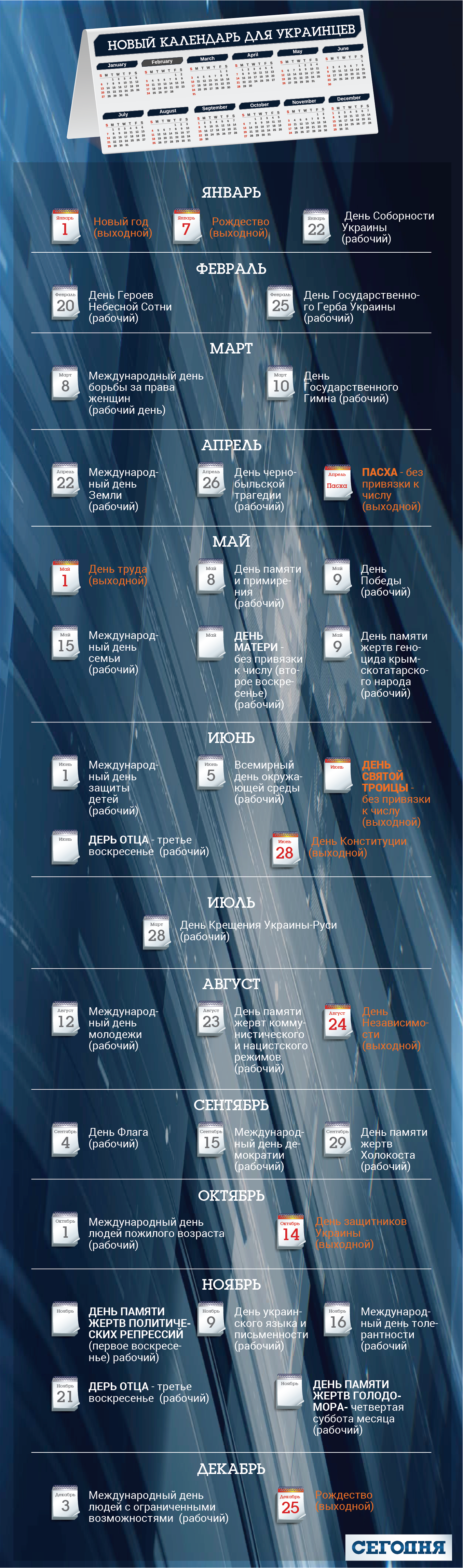 В этом году украинцам положено дополнительно 11 выходных, на Новый год, Рождество, Пасху, День Независимости, День Победы и т.д. Если законопроект Института памяти поддержит парламент, уже в следующем году вместо 11 выходных останется девять. Восьмого марта и девятого мая остаются праздничными днями: концерты и официальные мероприятия никто отменять не планирует, однако выходных в эти дни не будет.