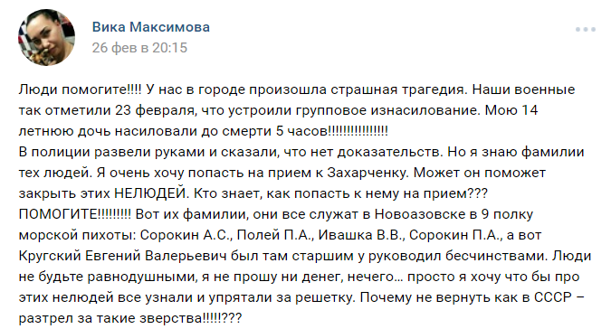 За словами жінки, її дочку 23 лютого згвалтували найманці 9-го полку морської піхоти в/ч 08819.
