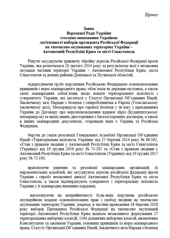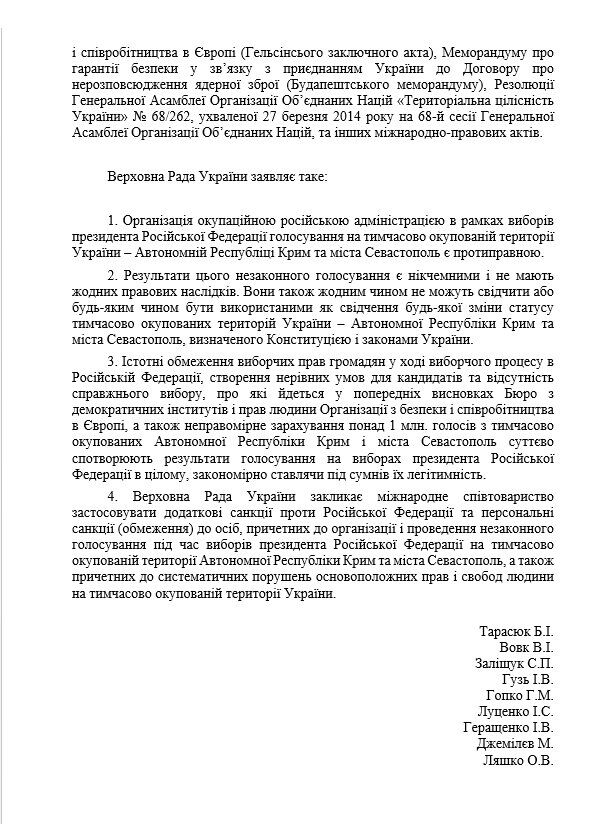 Рада призывает международное сообщество применить дополнительные санкции против России и персональные санкции к лицам, причастным к организации и проведению незаконного голосования во время выборов президента России на территории Крыма, а также причастным к систематическим нарушениям основополагающих прав и свобод человека на временно оккупированной территории.
