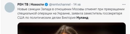 Нуланд сказала, що санкції будуть частково зняті у разі закінчення росією війни та її допомоги у відбудові України, якщо рф не тільки займеться відновленням миру, але й визнає український суверенітет, цілісність території та право на існування.