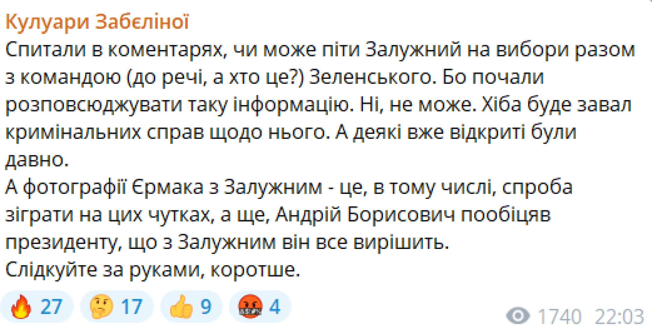 “Чи може піти Залужний на вибори разом із командою (до речі, хто це?) [президента України Володимира] Зеленського? Почали розповсюджувати таку інформацію. Ні, не може. Хіба буде завал кримінальних справ щодо нього. А деякі вже відкриті були давно”, — зауважила вона.