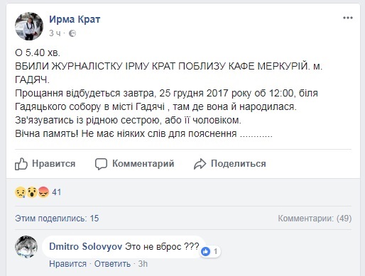 «В 5:40 убили журналистку Ирму Крат возле кафе Меркурий города Гадяч. Прощание состоится завтра, 25 декабря 2017 года, в 12:00, у Гадячского собора в городе Гадяч. Там, где она и родилась. Связываться с родной сестрой, или ее мужем. Вечная память! Нет никаких слов для объяснения…», – говорится в сообщении.