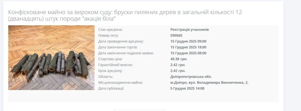На аукціоні виставили майно боржника — 12 брусків дерев акації білої. Стартова вартість 48,38 грн. Реалізує майно Соборний відділ державної виконавчої служби у Дніпрі.