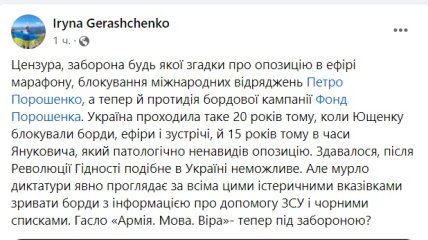 “Здавалося, після Революції Гідності подібне в Україні неможливе. Але мурло диктатури явно проглядається за всіма цими істеричними вказівками зривати борди з інформацією про допомогу ЗСУ та чорними списками. Гасло “Армія. Мова. Віра” — тепер під забороною?”, — написала політик.