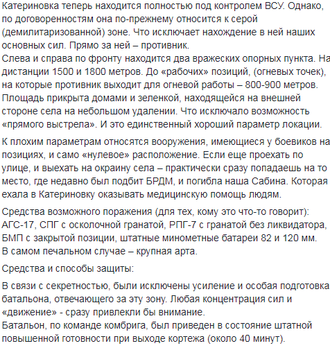 «Считаю необходимым, предоставить вам информацию «изнутри», от непосредственного участника событий – от меня.Общая ситуация: дополнительный риск состоял в том, что кроме президента в поездке принимали участия министр обороны, НГШ и глава СНБО. Несмотря на перемирие, и правильно выбранное время визита — поведение боевиков характеризуется спонтанностью и непредсказуемостью нарушений режима», — написал в Facebook участник АТО, военнослужащий 10-й ОГШБр Глеб Бабич.