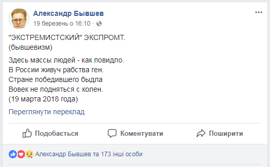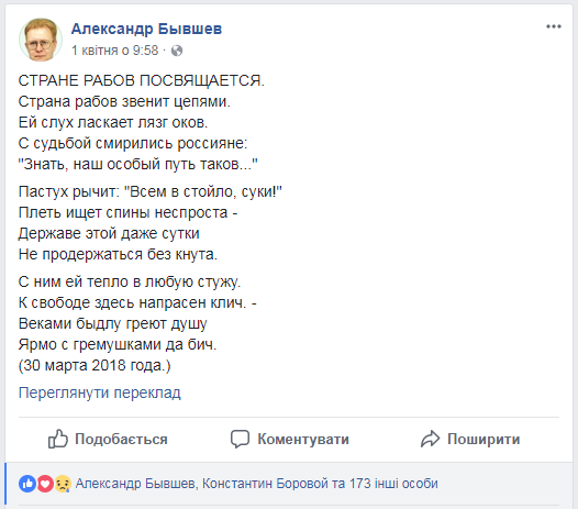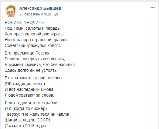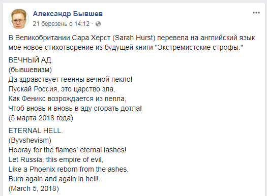В следующем стихотворении Бывшева «Украинские повстанцы» состава преступления не нашли. Но внесли автора в федеральный список террористов и экстремистов.