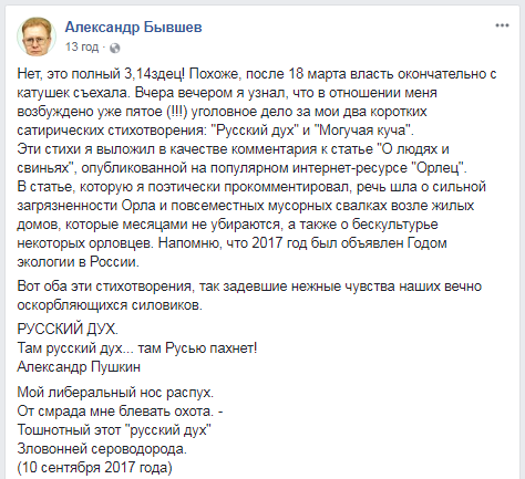 Пятое дело против Бывшева завели еще за два стихотворения. Речь идет о стихотворениях «Русский дух» и «Могучая кучка», посвященных сложнойэкологической ситуации в России.