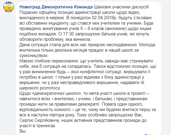 «В Новограде-Волынском учитель проводит урок, это происходит в «Демократической школе». И это не первый раз. Как на это смотрят родители??? А директор в этой школе есть, или ей наплевать на это??? Задумайтесь, родители, как ваших детей воспитывают!!!» — написал он.