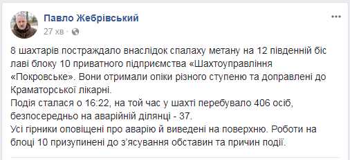 Восемь шахтеров пострадали в результате вспышки метана на частной шахте «Шахтоуправления Покровское» в Донецкой области.