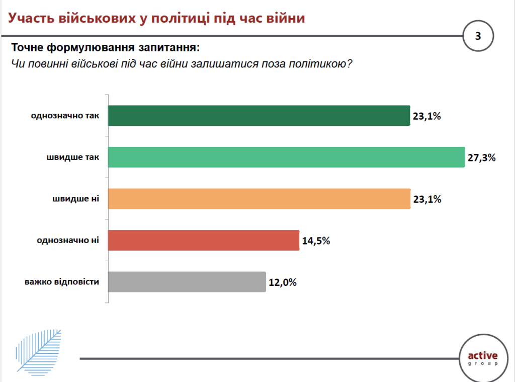 На запитання “Чи повинні військові під час війни залишатися поза політикою?” 23,1% респондентів відповіли “однозначно так”, ще 27,3% – “швидше так”. Водночас 23,1% обрали варіант “швидше ні”, 14,5% – “однозначно ні”, а 12,0% не змогли визначитися.