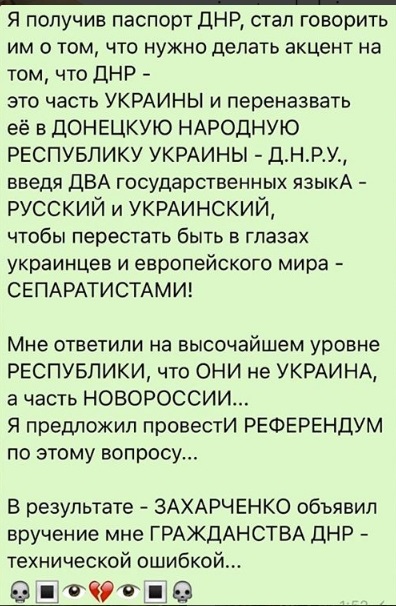 «Я, получив паспорт ДНР, стал говорить им о том, что нужно делать акцент на том, что ДНР – это часть Украины и переназвать ее в Донецкую народную республику Украины – Д.Н.Р.У., введя два государственных языка – русский и украинский, чтобы перестать быть в глазах украинцев и всего мира сепаратистами. Мне ответили на высочайшем уровне республики, что не Украина, а часть Новоросии. Я предложил провести референдум по этому поводу. В результате – Захарченко объявил вручение мне гражданства «ДНР» технической ошибкой», – написал Джигурда.