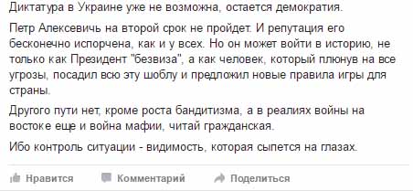 “Майдан убрал установление диктатуры. Мафию он не убрал. Майдан дал шанс переходу от дикого капитализма к цивилизации. Но в стране война, и из РФ сюда подтянулись воры в законе(это еще нормальные чувачки, не мокрушники), и откровенные отморозки и ублюдки. У нас выгнали диктатора, но мафия «бессмертна». Мафия в каждом селе, городке, мегаполисе”, — разочарованно пишет Гай.
