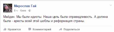 “Мы выгнали недодиктатора. Майдан не дал расейцам довести интеграцию Украины до конца. Майдан заставил их сделать фальстарт с Крымом и ОРДЛО. Поэтому не»… до Харькова и Киева»», — пишет Гай, отмечая, что новый президент — Петр Порошенко – делает попытку перехода к новому цивилизованному государству. Он якобы пытается “договориться” с власть имущими, но те восприняли это как сигнал к продолжению грабежей, рейдерству и т. п.
