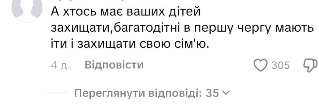 Думки ще низки дописувачів розділилися. Хтось поставив запитання про те, мовляв, а якщо в родині одна чи дві дитини, вони теж потребують уваги батька. Деякі жінки-коментатори написали, що в їхніх сім`ях троє маленьких дітей, але чоловіки свідомо вирішили не використовувати право на відстрочку та станом на зараз захищають Україну на полі бою.