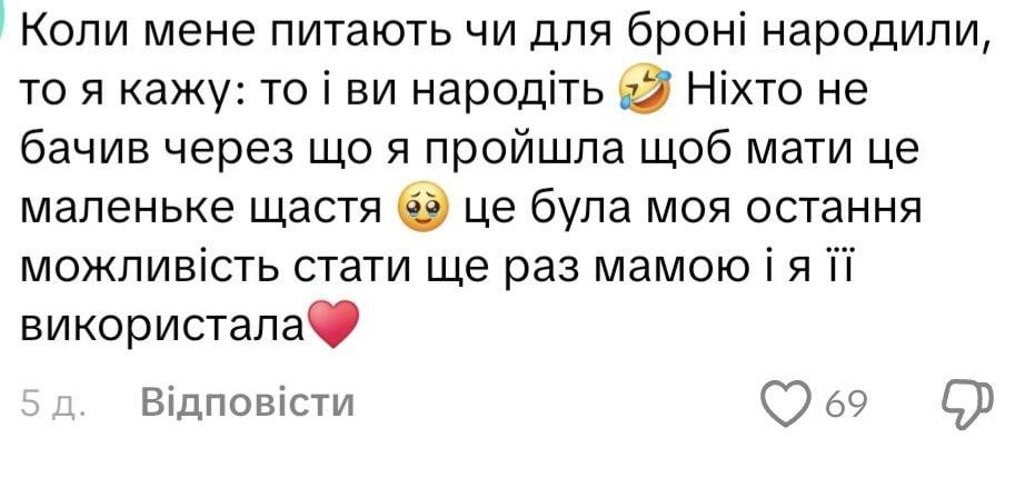 У коментування втрутилася, наприклад, і жінка, яка написала: «Коли мене запитують про те, чи для „броні“ народили, я кажу: „І ви народіть“. Ніхто не бачив, через що я пройшла, щоб мати це маленьке щастя. Це була моя остання можливість стати ще раз мамою, і я її використала».