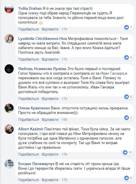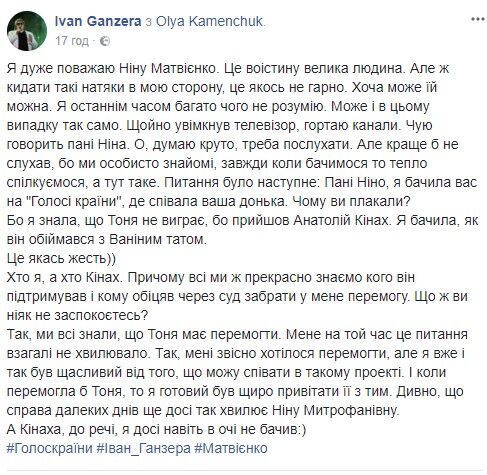 Украинский певец, победитель первого сезона шоу «Голос країни» в 2011 году Иван Ганзера написал в Facebook пост с возмущением по поводу заявления, якобы сделанного на днях народной артисткой Ниной Матвиенко.