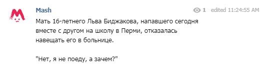 «Мать 16-летнего Льва Биджакова, напавшего сегодня вместе с другом на школу в Перми, отказалась навещать его в больнице: «Нет, я не поеду, а зачем?» — заверили в Mash.