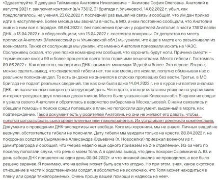 «Більше місяця ми дзвонили в частину, до МО, і нам постійно повідомляли, що Анатолій живий і з ним усе гаразд. 08.04.2022 р. без пояснення причин у батьків Анатолія в частині 73612 взяли ДНК, а 13.04.2022 р. в обід повідомили, що 15.04.2022 р. відбудеться похорон», — пише в заяві Софія. За її інформацією, у березні військового шукали представники військкомату. Начебто пошуки вели навіть на території ЧАЕС (була захоплена російськими військами з 24 лютого до 31 березня 2022 року).
