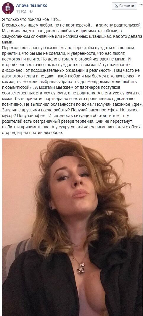 «В семьях мы ищем любви, но не партнерской … а замену родительской. Мы ожидаем, что нас должны любить и принимать любыми, в замусоленном слюнявчике или испачканных штанишках. Как это делала мама», — пишет телеведущая.