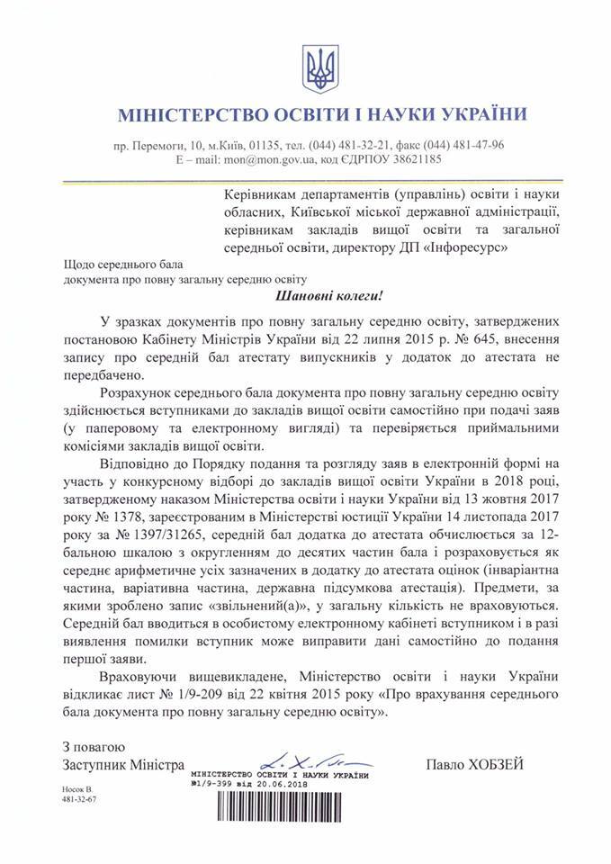 В связи с нововведением Министерства образования выпускники школ теперь должны самостоятельно рассчитывать средний бал аттестата. Об этом в Facebook сообщил член коллегии ведомства Сергей Горбачев, ссылаясь на письмо МОН «О среднем балле документа о полном общем среднем образовании», которое 20 июня подписал заместитель министра Павел Хобзей, передаёт Бизнес.Медиа.