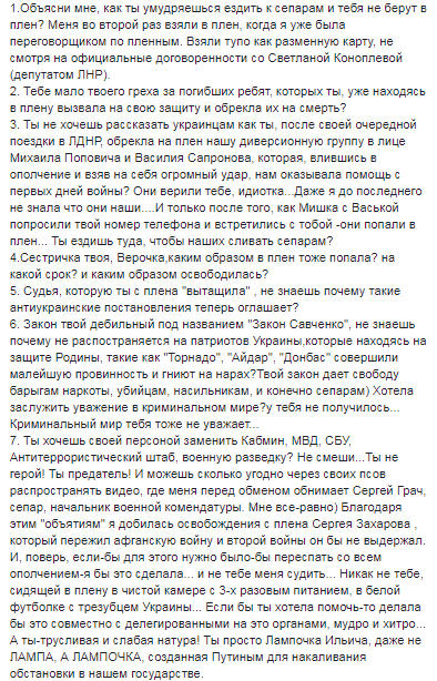 «Мене вдруге взяли в полон, коли я вже була переговорником по полоненим. Взяли тупо як розмінну карту, не дивлячись на офіційні домовленості зі Світланою Конопльовою. Тобі мало твого гріха за загиблих хлопців, яких ти, вже перебуваючи в полоні, викликала на свій захист і прирекла їх на смерть? «, — запитує вона.