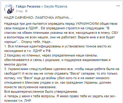 «Ти не хочеш розповісти українцям як ти, після своєї чергової поїздки в «Л / ДНР», прирекла на полон нашу диверсійну групу в особі Михайла Поповича та Василя Сапронова. Вони вірили тобі, ідіотка … Навіть я до останнього не знала, що вони наші. І тільки після того, як Мишка з Ваською попросили твій номер телефону і зустрілися з тобою — вони потрапили в полон … Ти їздиш туди, щоб наших зливати сепарам? «, — додає Різаєва.